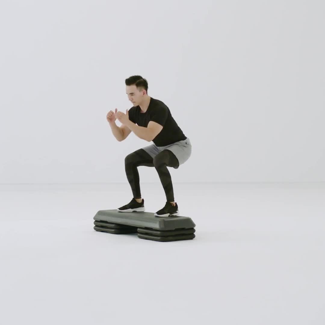 动作准备选择高度 15-25 厘米的稳定踏板(初学者从 15 厘米开始),放置在平整地面。双脚与肩同宽站立在踏板正前方,膝盖微屈,身体略微前倾,保持下肢弹性。收紧核心,沉肩挺胸,脊柱中立,双手自然屈肘置于体侧,目光注视踏板,做好跳跃准备。动作执行吸气时,双腿屈膝半蹲,臀部向后下方坐,重心下沉,直至大腿与地面呈 45°-60° 角(半蹲幅度)。呼气时,下肢发力蹬地,借助臀肌和股四头肌力量,向上跳跃,同时双脚落在踏板中央,落地时膝盖微屈缓冲。短暂停留 0.5 秒,保持身体稳定,随后再次屈膝半蹲,发力蹬地向前下方跳跃,双脚回到踏板前方初始位置。上下跳跃过程连贯,保持节奏均匀,重复 “地面半蹲跳→踏板落地→踏板半蹲跳→地面落地” 的循环。动作要点发力核心是股四头肌和臀肌,跳跃时双脚同时起落,避免单脚发力失衡。半蹲时膝盖不超过脚尖,与脚尖方向一致,不内扣或外撇,减少膝关节压力。跳跃高度以平稳落在踏板为准,不追求过高腾空,重点保证动作规范与落地稳定性。注意事项训练前热身下肢(脚踝、膝盖、髋关节)及核心,避免跳跃时肌肉拉伤或关节扭伤。踏板需固定牢固,避免滑动,初学者可先徒手练习踏板上下踏步,熟悉节奏后再加入跳跃。若膝关节或脚踝出现不适,立即停止动作,可降低踏板高度、减小半蹲幅度或改为无跳跃的踏板上下踏步。
