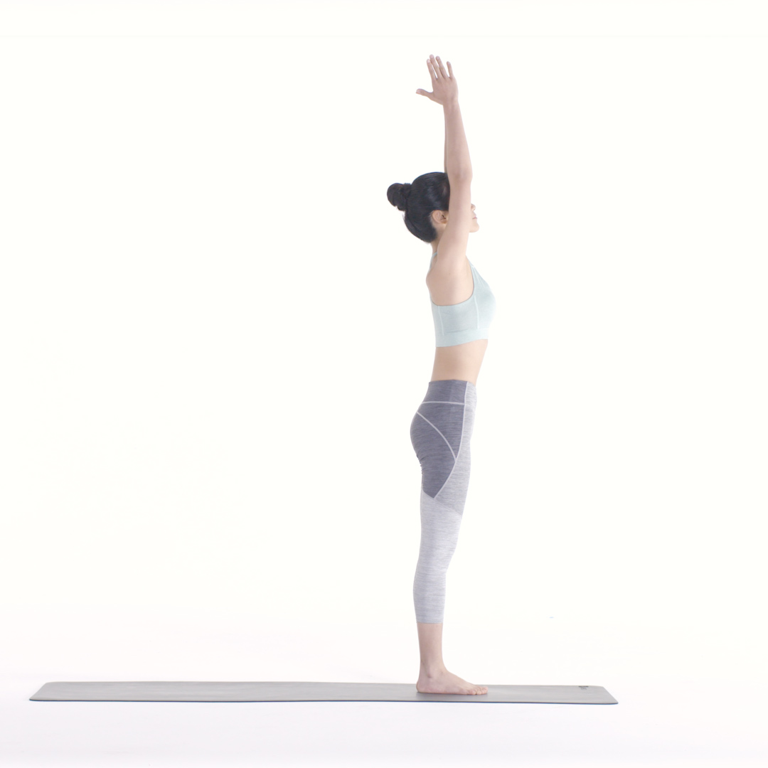 吸气,双臂向前上方伸直与肩同宽,无需伸过头顶