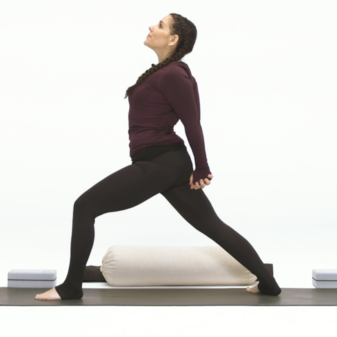- 迈左脚于双手间,后脚脚趾微微向外打开,吸气双手手臂向上,来到战士一式