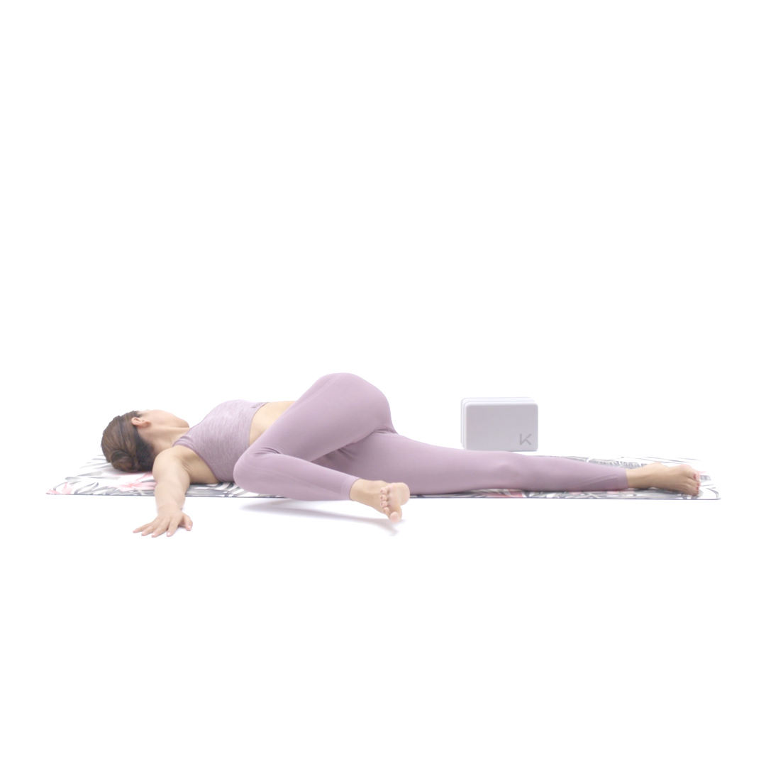 再次吸气,屈左膝大腿靠近腹部,呼气左膝倒向右侧点地,脊柱随之扭转