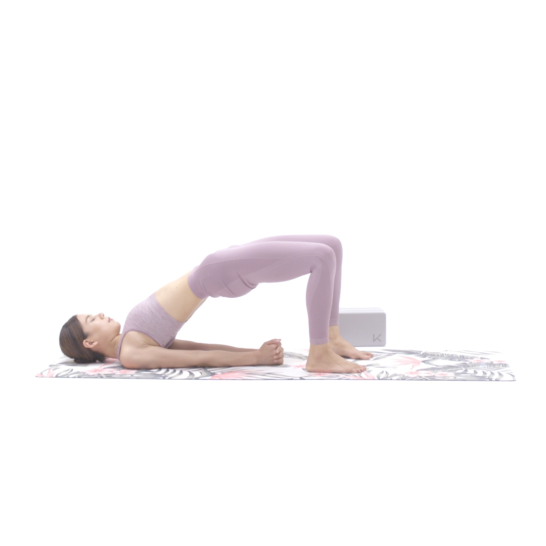 仰卧在瑜伽垫上,双腿屈曲,脚跟踩地