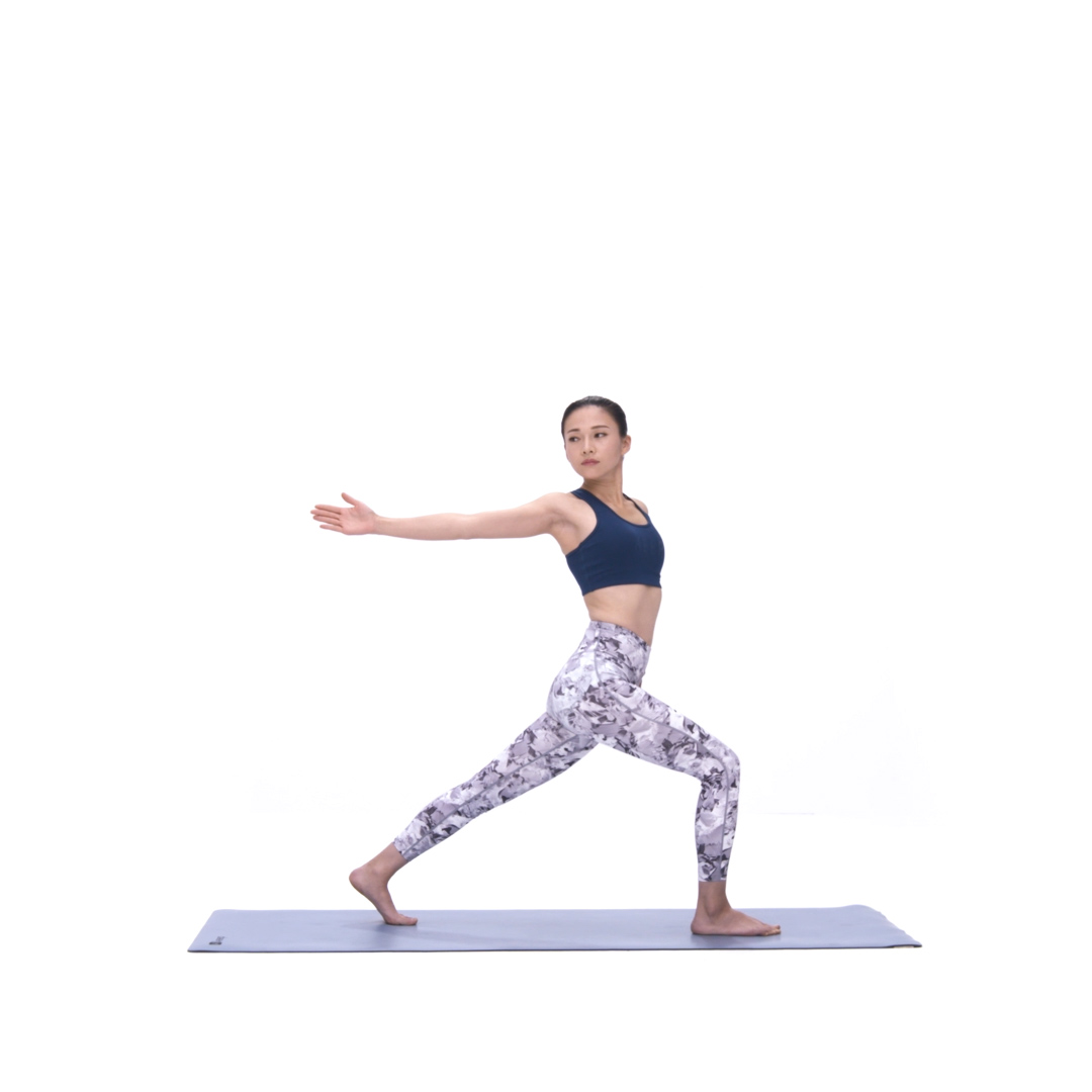 呼气,扭转身体向右侧,右臂向右后方延展,眼看右手