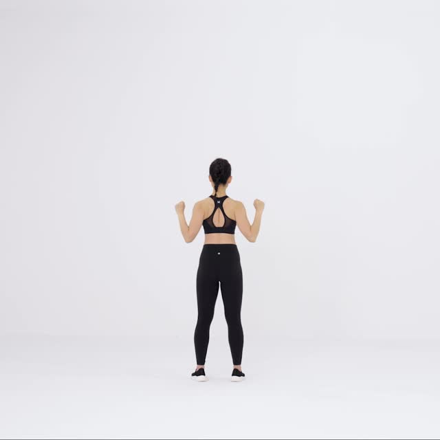 站立姿势,双手举过头顶,掌心向前保持握拳状态,挺胸沉肩