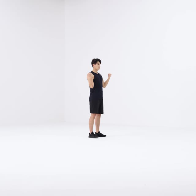 双手握拳,拳心相对,大臂贴紧身体两侧