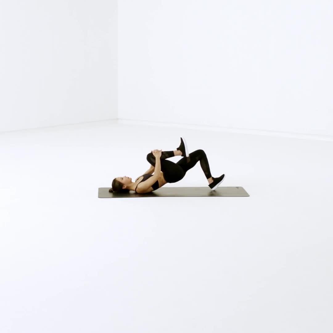 仰卧在瑜伽垫上,双手抱住右侧膝盖,防止骨盆前后转动
