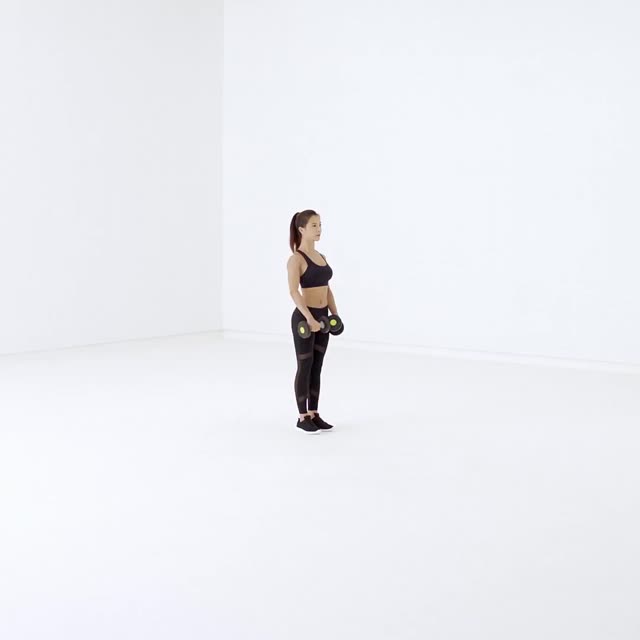 - 自然站立,挺胸,收紧腹部,双手握紧哑铃放于大腿前侧