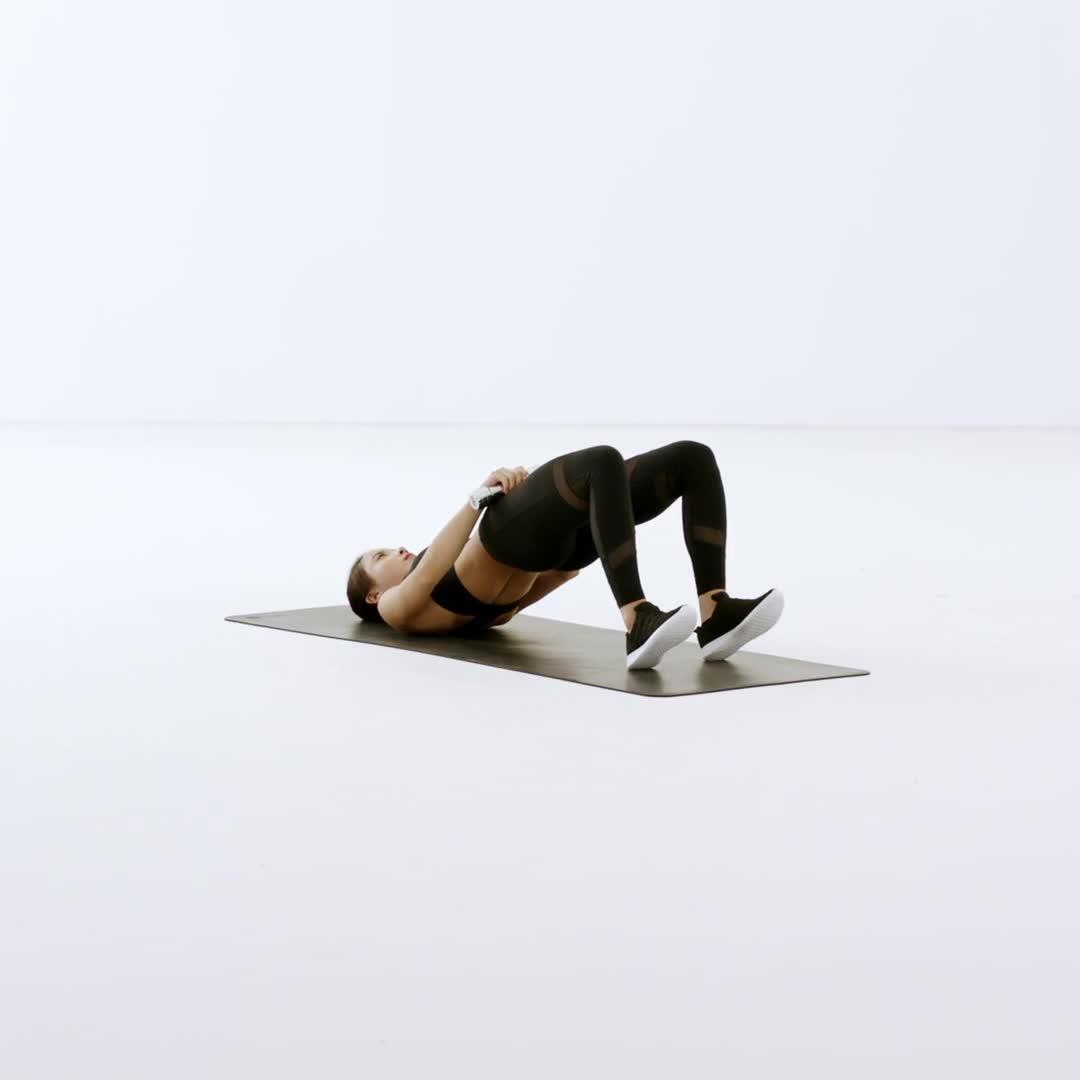 - 仰卧在瑜伽垫上,屈膝,双脚与肩同宽脚后跟着地支撑,勾脚尖;双手握小哑铃置于下腹部