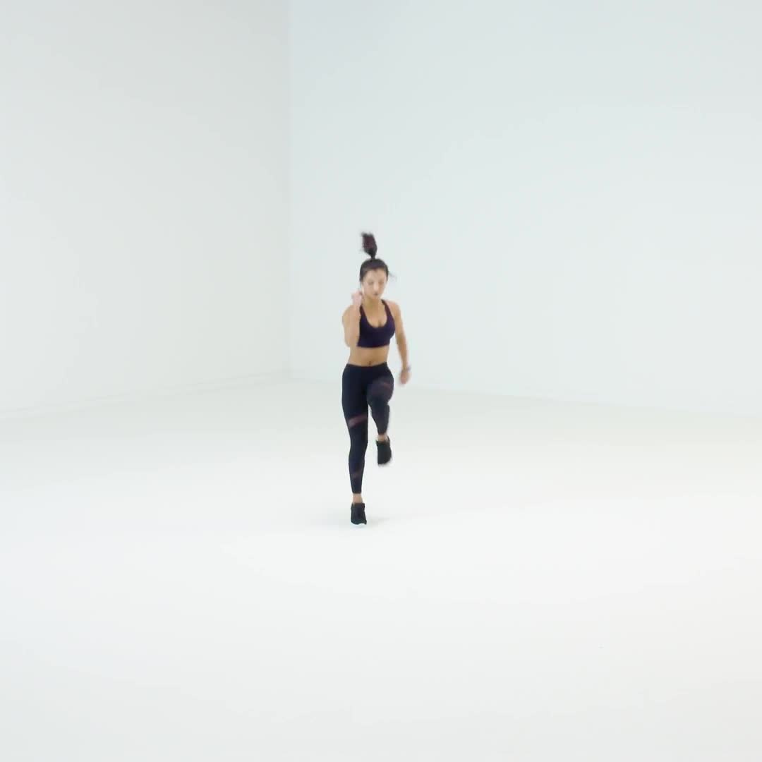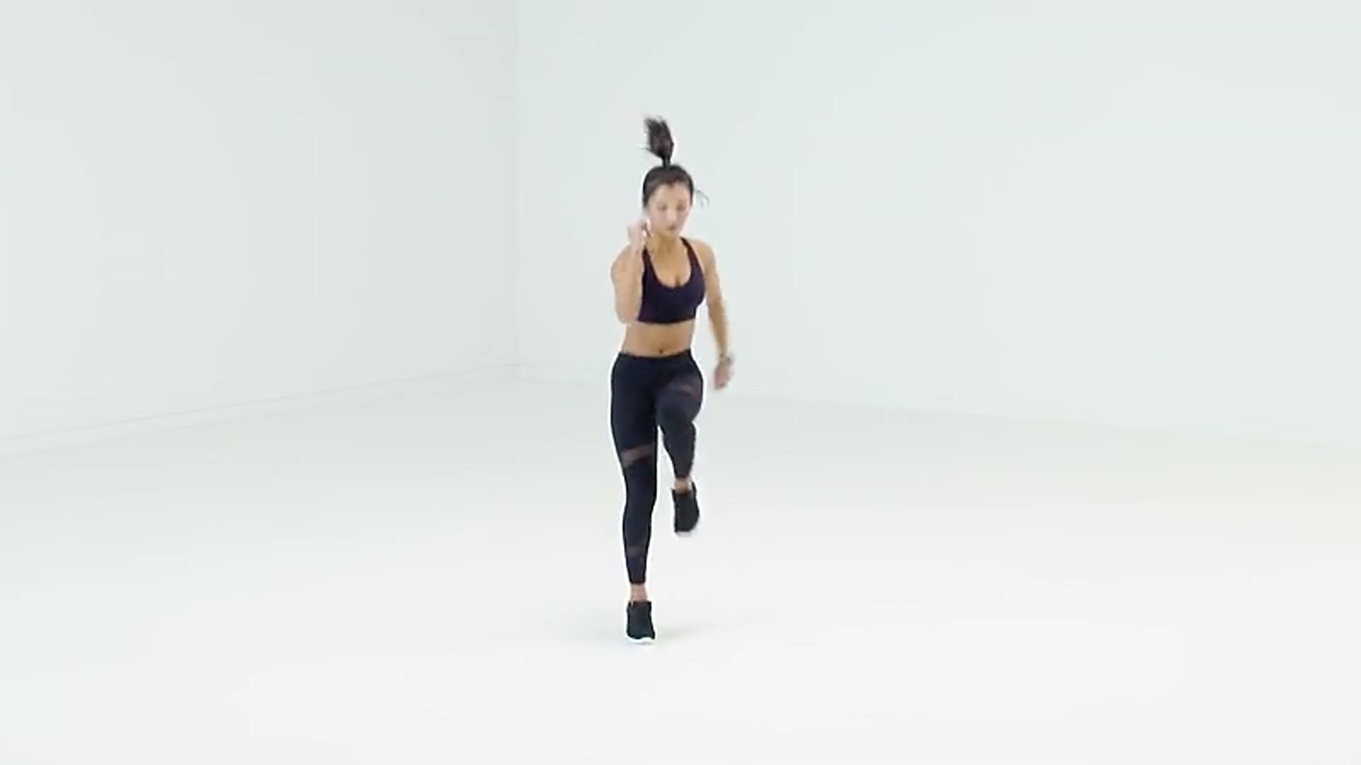 收回左腿,完成交叉跳一次,将右腿提膝靠近胸部,双手自然摆臂