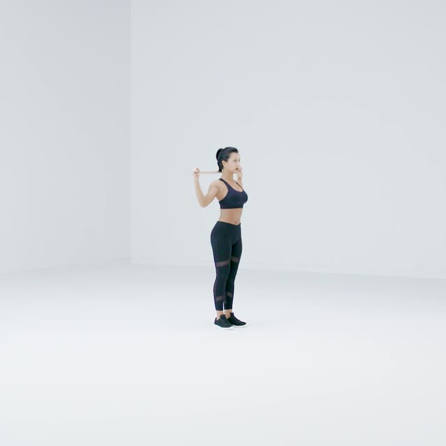 双手伸直,举过头顶,随后屈肘将弹力带下拉,背部用力夹紧,弹力带在颈后