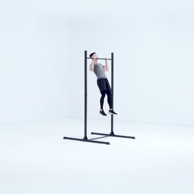 跳起抓杠,借助跳跃的惯性顺势拉起身体到最高点下巴过杠,至最高点时收紧肩胛骨