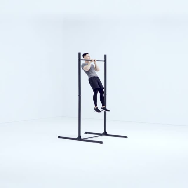 双手正握住杠,双手间约一掌距离,脚离地