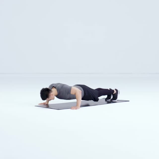 - 俯卧撑于垫上,腰背挺直,从侧面看身体成一条直线,双手撑于胸部两侧,间距为1.5倍肩宽