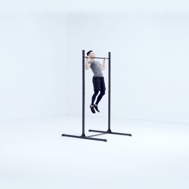 双手正握住杠,握距大约为肩宽1.5倍,双腿曲膝交叉,脚离地