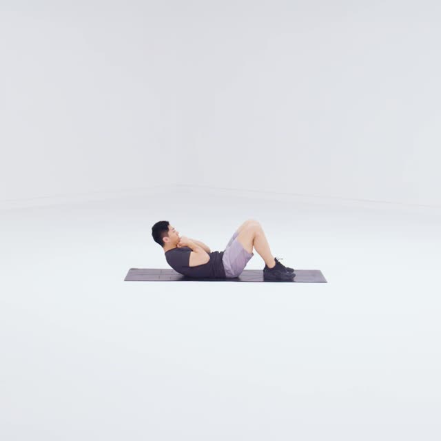 双手握拳抵在下巴位置,用腹肌的力量将肩部和上背部卷离地面,在最高点略作停顿后,缓慢回到起始位置