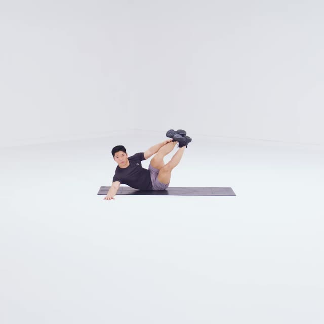 把骨盆与双腿固定成一个整体运动,通过骨盆的侧向转动带动双腿抬起;同时左侧腹部收紧,拉近左肘和大腿的距离,至最高点略作停顿,缓慢回到起始状态