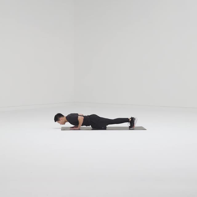 俯卧撑于垫上,腰背挺直,从侧面看身体成一条直线,双手撑于胸部两侧,间距与肩同宽,夹紧肩胛骨