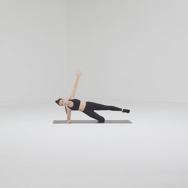 右手肘支撑在瑜伽垫上,右侧大臂垂直于地面,左臂向头顶上方伸展,右腿屈膝撑地,左腿伸直,全身收紧保持身体呈一条直线