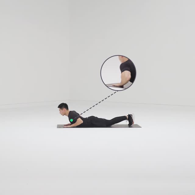 俯卧在瑜伽垫上,腿部完全贴紧地面,双手撑于胸部两侧,间距比肩略宽