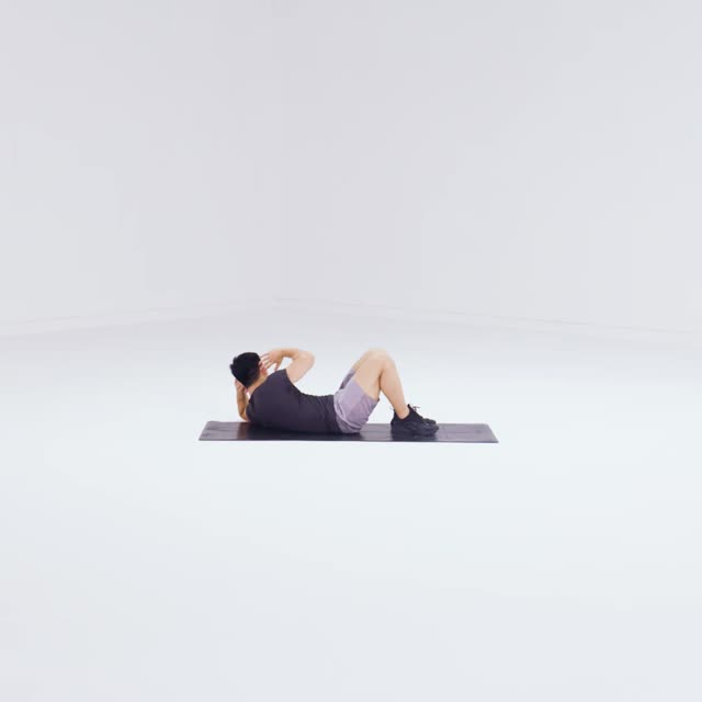 躺于垫上,手臂屈肘放于头部两侧,双腿屈膝双脚踩实地面