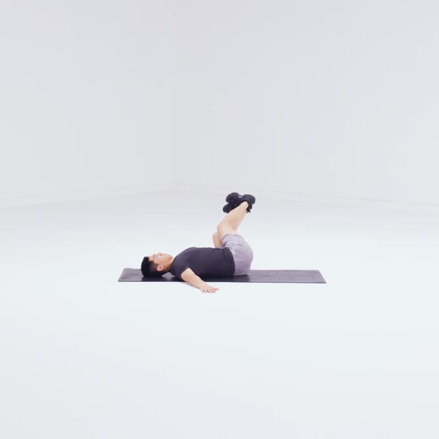躺在垫上,手臂打开,掌心朝下,两臂与身体形成一个T字,双腿伸直抬起
