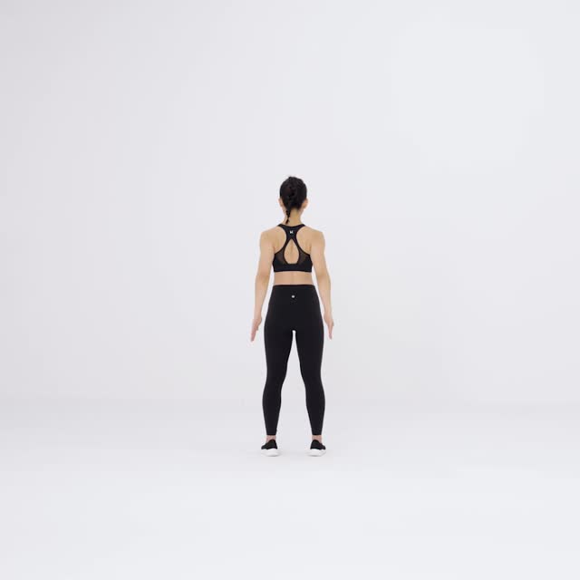 站立姿势,双手手肘伸直在身体两侧,手臂平行地面,掌心向下,沉肩收腹