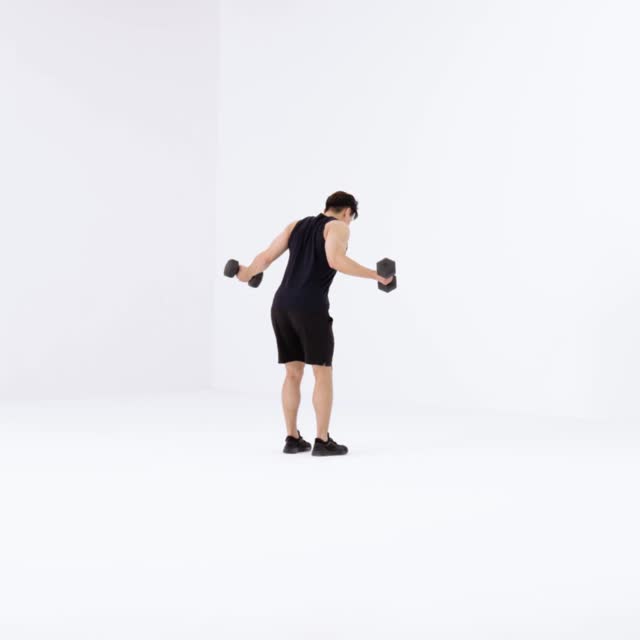 屈膝俯身,身体与地面呈 30° 至 45° 角,屈肘,双手紧握哑铃,大拇指朝外