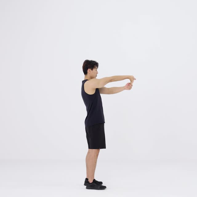 左手轻轻掰住右手手指,顺着呼吸放松整个右臂