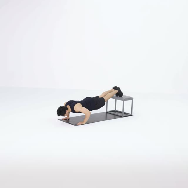 双手撑于垫上,间距比肩稍宽,手指用力抓垫子,双脚放于凳子上,身体绷呈一条直线,腰背挺直