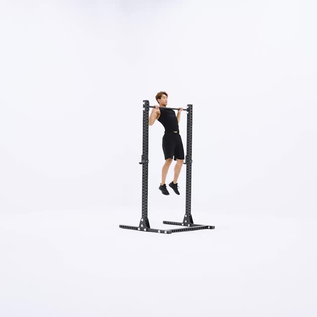 跳起抓杠,借助跳跃的惯性顺势拉起身体,最高点处胸触杠,到最高点稍作停顿后下落